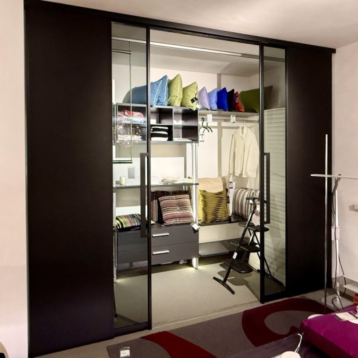 behinhaltet 2 feststehende Glaselemente Material Persolglas grau, Kante poliertsowie 2 Schiebtüren T5, Füllung 1/3 Persolglas klar, 2/3 Leder schwarz Stangengriff Aluminium schwarzinkl. 2-läufige Boden- und DeckenschieneBreite 282cm, Höhe 242,6cm