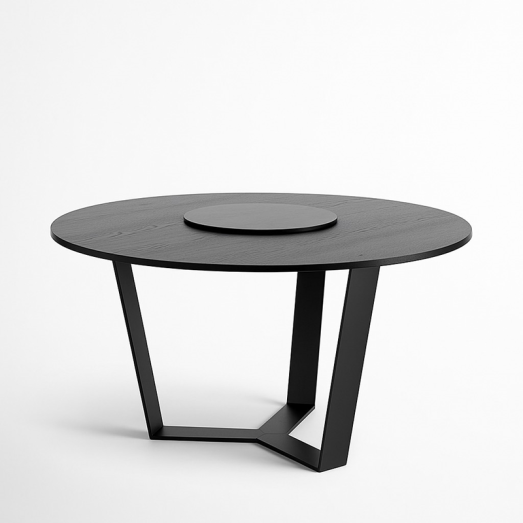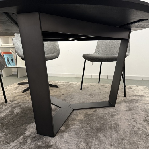 Design Gil Coste 2017Massivholzplatte brettverleimtEiche 14 schwarz gebürstet, matt lackiertGestell Flachstahl auf Gehrung verbundengebürstet und anthrazit pulverbeschichtetinkl. 'Lazy Susan' Drehplatte D=70cmPlattenstärke 2,8cm Kante leicht gefastDurchmesser 140cmHöhe 74,5cm