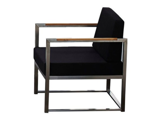 Sitz- und Rückenkissen 100% Polyacryl Farbe Schwarz, mit Reißverschluss, handwaschbar Armlehnen mit Teakeinlagen Gestell Edelstahl geschliffen Breite 62cm, Tiefe 67cm, Höhe 62cm Sitztiefe 52cm, Sitzhöhe 40cm EINZELSTÜCK - IN EDELSTAHL