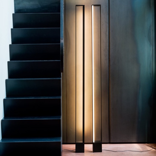 Design Roberto Paoli Ausführung schwarzindirektes Licht nach oben und hintengetrennt dimm- und schaltbar an SteleLED max. Leistung 41+16W4080-2660 lm, 2700K warmweißBreite 12cm, Tiefe 10cm, Höhe 185cm