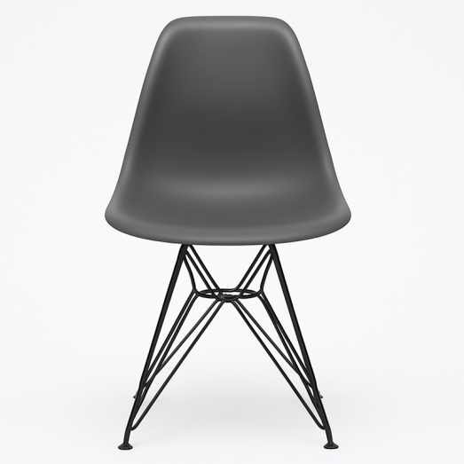 Design Charles und Ray Eames 1950PP-Kunststoffschale ohne PolsterFarbe 56 granitgrauDraht-Untergestell mit Verstrebungenbasic dark 30, nicht stapelbarFilzgleiter für Hartboden basic dark 05Sitzhöhe 43cm (neue Höhe)Breite 46,5cm, Tiefe 55cm, Höhe 83cm