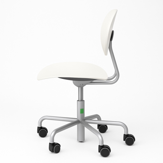 Design Peter Horn, 2005/2006Gestell silber, RAL 9006Formholz Buche weiss lackiert, RAL 9010mit Rollen SicherheitstechnikSitzhöhe 30-41,5cmfür Körpergröße etwa von 1,10 bis 1,60m