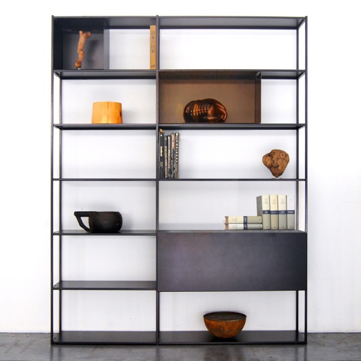 Design Maurizio PeregalliVierkantrohr 15x15mm+Stahlblech 2mmEpoxylack copper black sand touch+bronze3x Leiter 6 Raster senkrecht 7x Fachb. B=74cm + 7x FB B=98,5cm1x Box 100 m. Klappe MagnetverschlussBox offen1x35x31cm+1x70x31cmH36cmBreite 177cm, Tiefe 34cm, Höhe 226cm