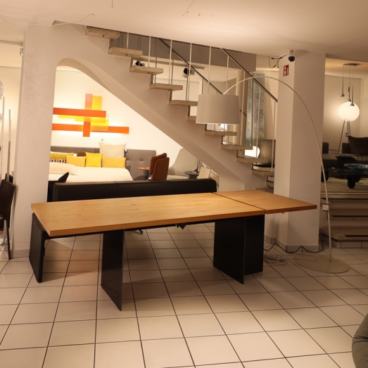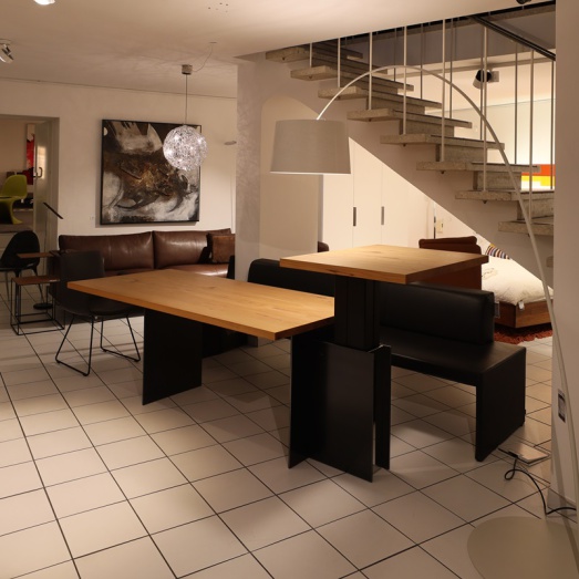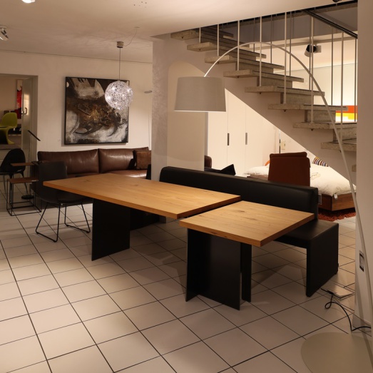 Kombination aus fester Tischplatteund Ansatztisch höhenverstellbarelektrisch und stufenlosUntergestell Rohstahl geölt Platte 40mm massiv Ulme NaturartBreite 190+70=260cmTiefe 90cm, Höhe 75 bzw. 70-110cm