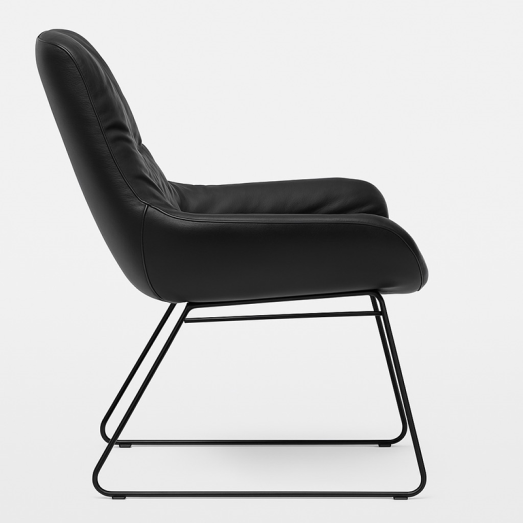 Design Birgit HoffmannVariante uni, mit kurzer ArmlehneBezug Leder Sahara Ebony 60009Drahtgestell 1.1 Metall schwarz ME001inkl. KunststoffgleiterSitzhöhe 47 cm