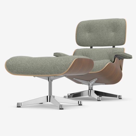 Design Charles & Ray Eames 1956Fuß komplett Alu poliertSchale Nussbaum schwarz pigmentiertBezugmaterial Stoff 0500 Nubia Farbe 09 elfenbein/forestinkl. Filzgleiter für ParkettHocker B 63cm, H 42cm, T 56cmChair B 84cm, T 85cm, H 89cm