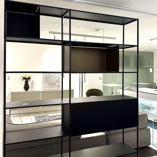 Design Maurizio PeregalliVierkantrohr 15x15mm+Stahlblech 2mmEpoxylack copper black sand touch+bronze3x Leiter 6 Raster senkrecht 7x Fachb. B=74cm + 7x FB B=98,5cm1x Box 100 m. Klappe MagnetverschlussBox offen1x35x31cm+1x70x31cmH36cmBreite 177cm, Tiefe 34cm, Höhe 226cm