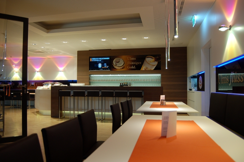 Mit großem Stolz erinnern wir uns immer an die Entstehungsgeschichte dieser Lounge: Quasi über Nacht wurde unserem Mitbewerber der Auftrag entzogen und wir mit der Bitte konfrontiert, innerhalb von 4 Wochen ein neues Konzept für eine funktionale VIP-Lounge zu entwickeln und inkl. Detailplanung von Licht und Möbel sowie den Einbau fristgerecht zum Eröffnungstag der Ratiopharmarena zu übergeben.