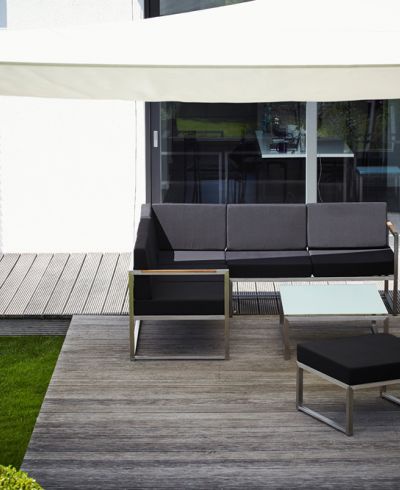 Sitz- und Rückenkissen 100% Polyacryl Farbe Schwarz, mit Reißverschluss, handwaschbar Armlehnen mit Teakeinlagen Gestell Edelstahl geschliffen Breite 62cm, Tiefe 67cm, Höhe 62cm Sitztiefe 52cm, Sitzhöhe 40cm EINZELSTÜCK - IN EDELSTAHL