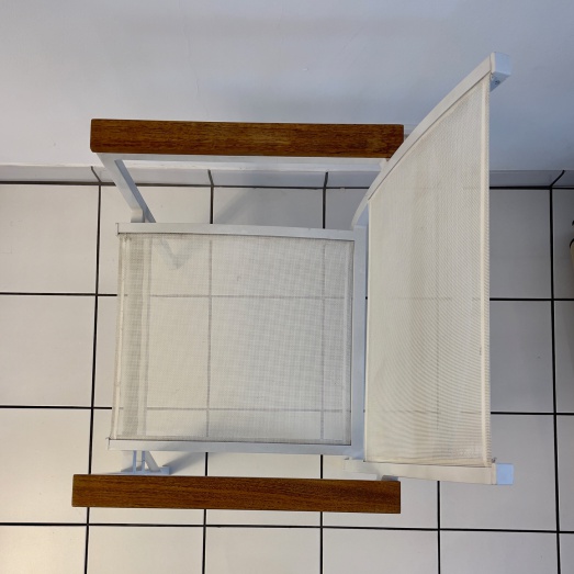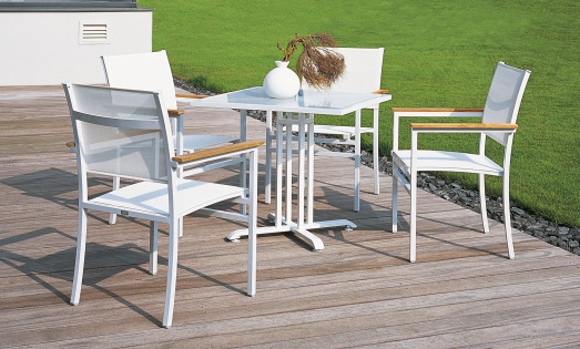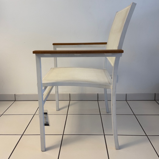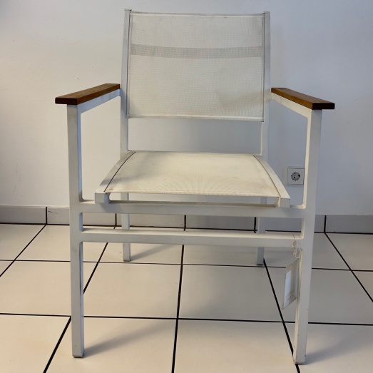 Gestell Alu pulverbeschichtet weißSitz-/Rückenbespannung Batyline weißArmauflagen Teakholz unbehandeltSitzhöhe 44cmBreite 63cm, Tiefe 60cm, Höhe 92cm