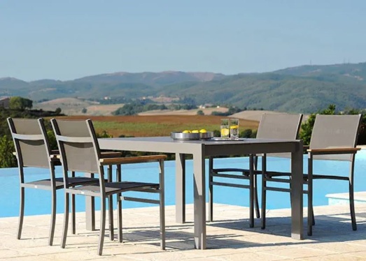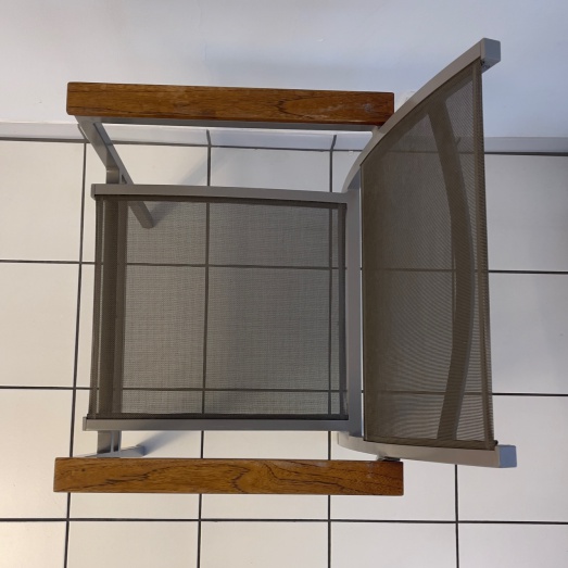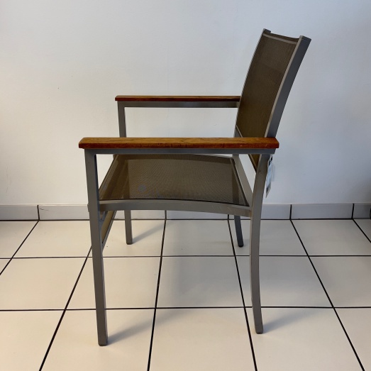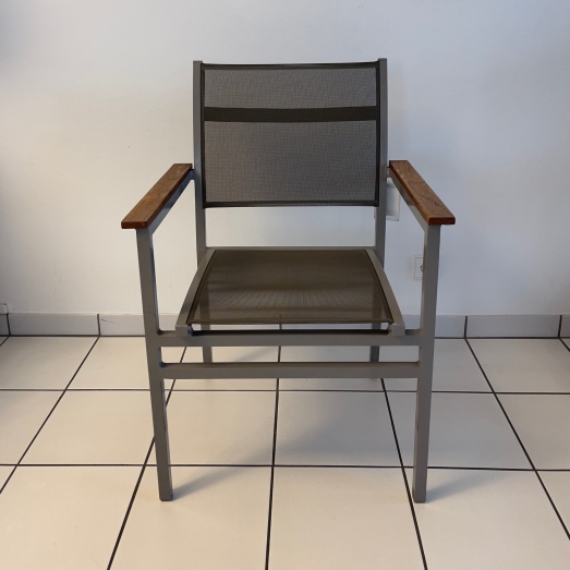 Gestell Alu pulverbeschichtet grauSitz-/Rückenbespannung Batyline grauArmauflagen Teakholz unbehandeltSitzhöhe 44cmBreite 63cm, Tiefe 60cm, Höhe 92cm