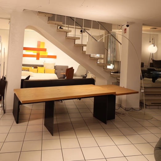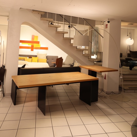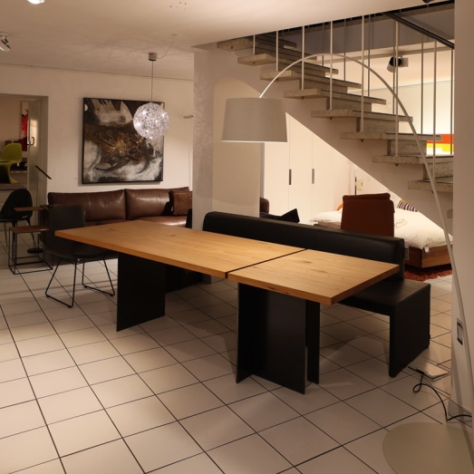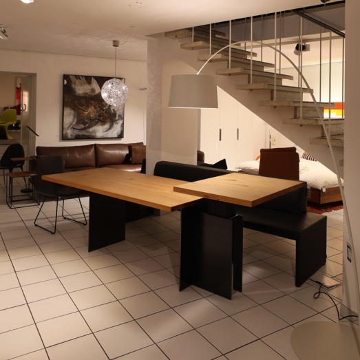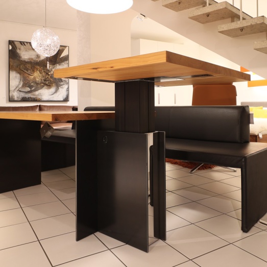 Kombination aus fester Tischplatteund Ansatztisch höhenverstellbarelektrisch und stufenlosUntergestell Rohstahl geölt Platte 40mm massiv Ulme NaturartBreite 190+70=260cmTiefe 90cm, Höhe 75 bzw. 70-110cm