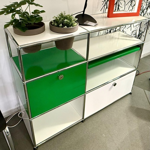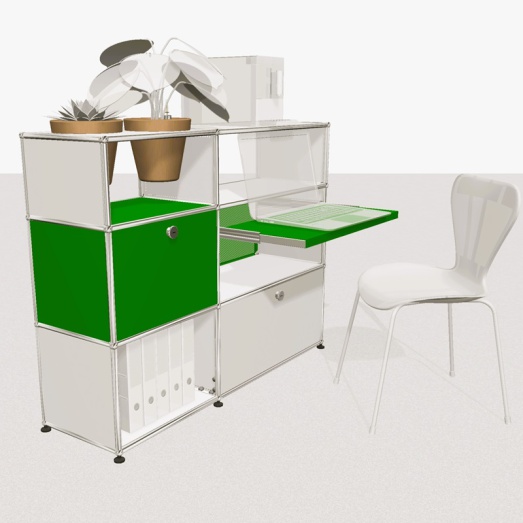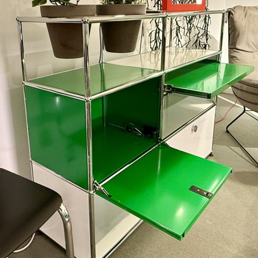 Stahlrohrrahmen verchromtMetalltablare reinweiß und grün lackiertdavon 1x Rückwand perforiert2x Klappe, 1x Auszugtablar,2x Töpfe basaltBreite 125+3 cm, Tiefe 35+3cm, Höhe 99cm