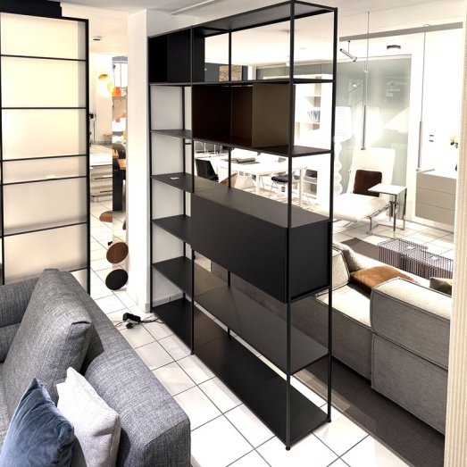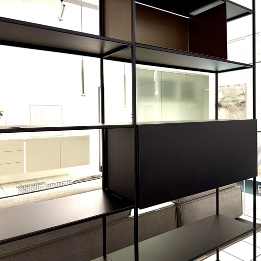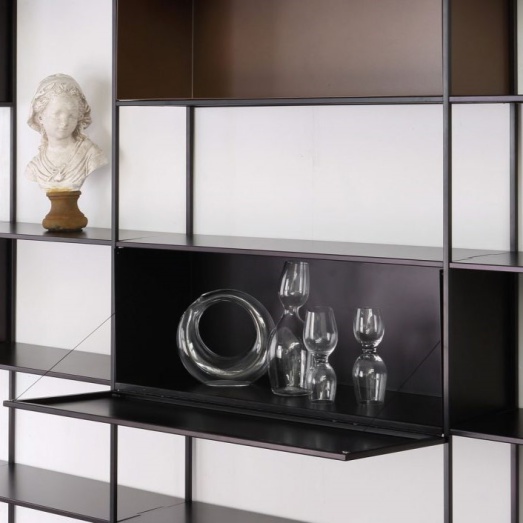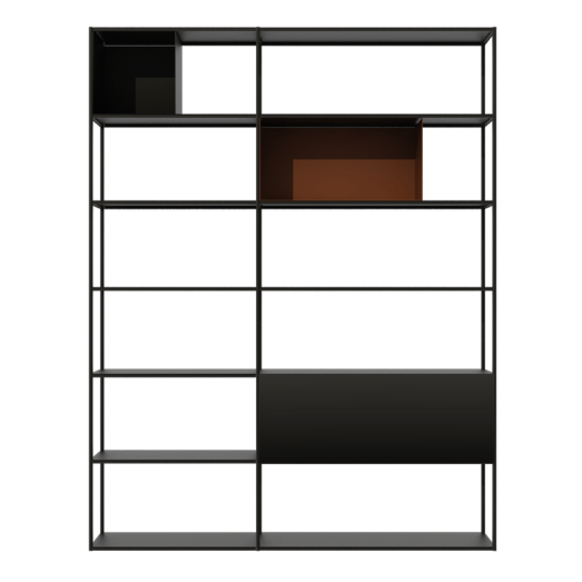 Design Maurizio PeregalliVierkantrohr 15x15mm+Stahlblech 2mmEpoxylack copper black sand touch+bronze3x Leiter 6 Raster senkrecht 7x Fachb. B=74cm + 7x FB B=98,5cm1x Box 100 m. Klappe MagnetverschlussBox offen1x35x31cm+1x70x31cmH36cmBreite 177cm, Tiefe 34cm, Höhe 226cm